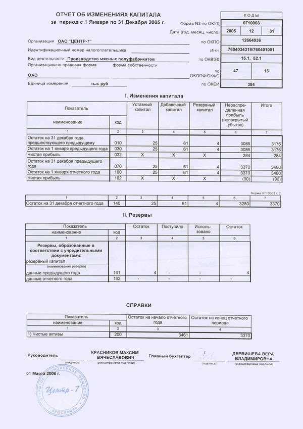 0710003. Отчет об изменениях капитала. Здесь содержаться данные об уставном капитале, резервном,  добавочном, а еще сведения о том, как изменяется величина нераспределенной прибыли экономического субъекта. Данный отчет в свою очередь состоит из трех разделов.