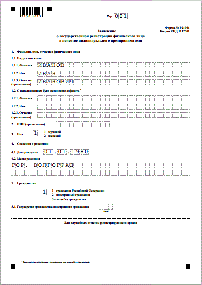 Заявление о государственной регистрации физического лица в качестве индивидуального предпринимателя (Ф.№Р21001)