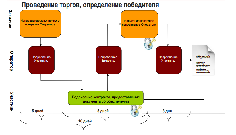 После внесения обеспечения победитель аукциона подписывает контракт, который направляется заказчиком, в течение 10-20 дней. Для этого используется ЭЦП.
